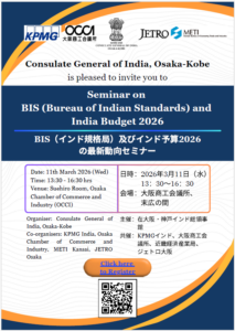 このたび、インド総領事館は KPMG India、経済産業省近畿経済産業局、 大阪商工会議所(OCCI)、JETRO 大阪と共催で、 「BIS(インド規格局)およびインド予算2026」に関するセミナー を開催します。